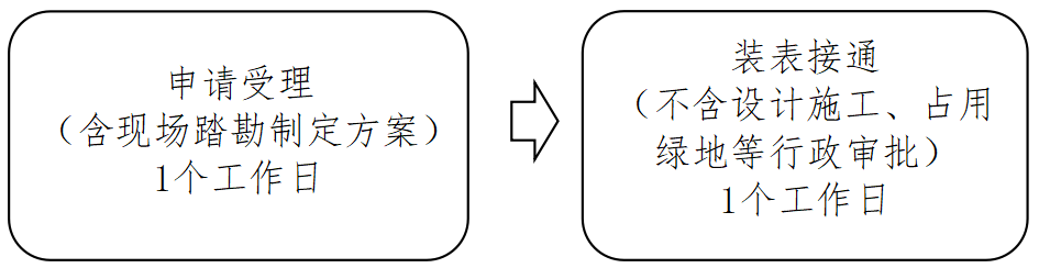 2.一般工程建設項目辦理環(huán)節(jié)為申請受理(含現(xiàn)場踏勘制定方案)、裝表接通(不含設計施工、占用綠地等行政審批),兩個環(huán)節(jié)總時長不超過2個工作日